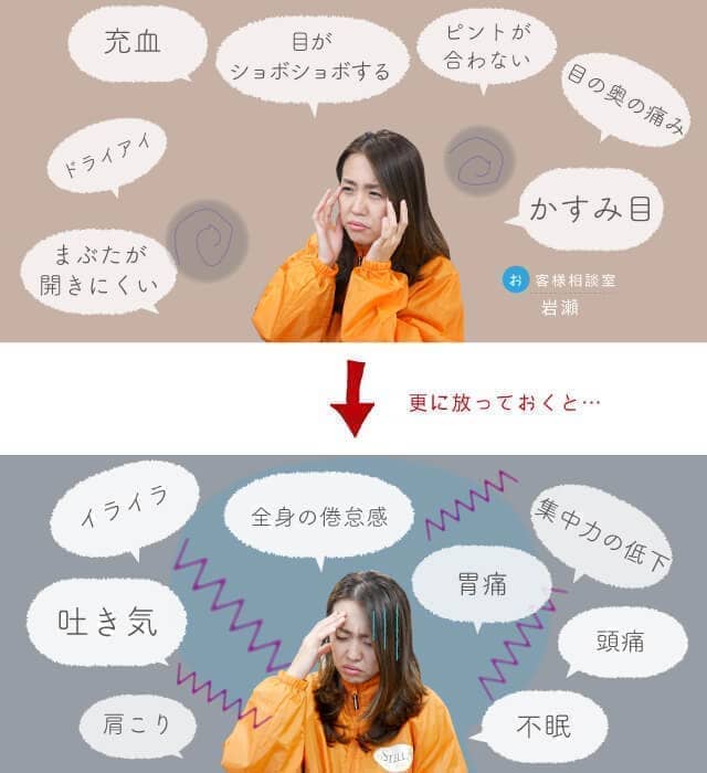 毛様体筋の緊張が解けにくくなり、疲れ目が進行